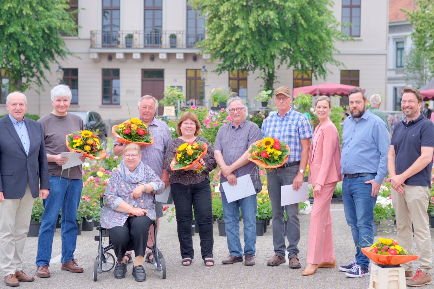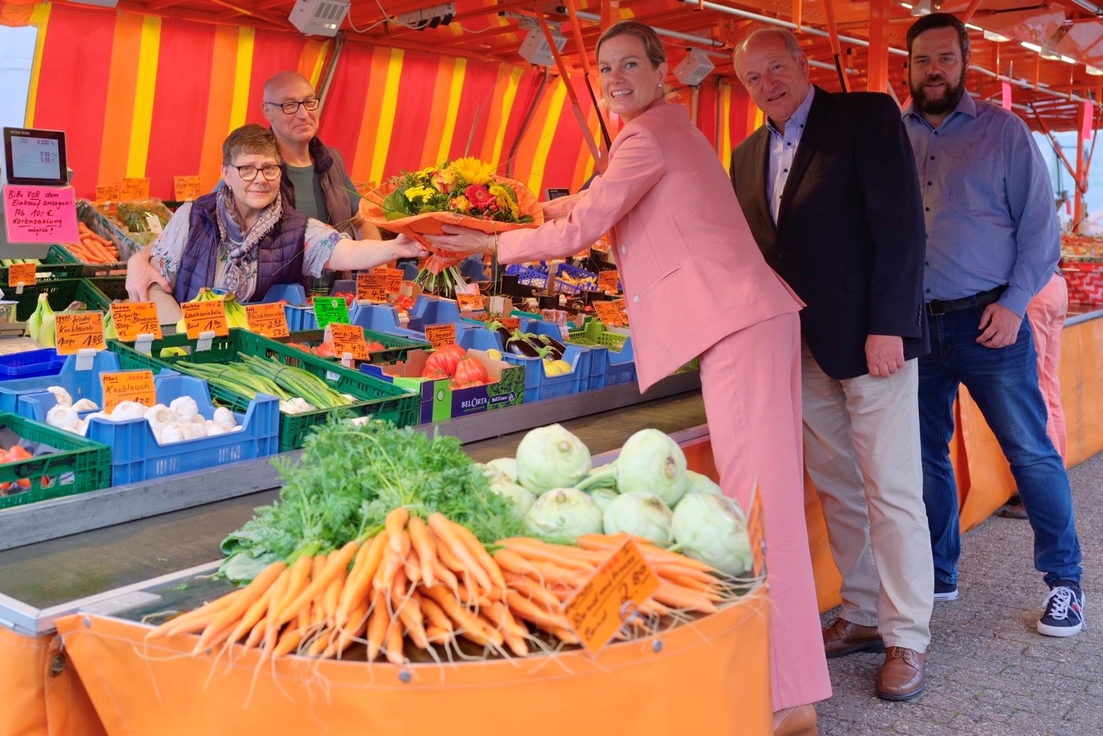 Oldenburg. Sie sorgen jede Woche aufs Neue dafür, dass Oldenburgs Bürgerinnen und Bürger zuverlässig mit frischem Obst, Gemüse, Pflanzen und mehr versorgt werden: Die Beschickerinnen und Beschicker auf den Oldenburger Wochenmärkten. In Abstimmung mit dem Verein Oldenburger Marktkaufleute e. V. hat die Stadtverwaltung auch in diesem Jahr langjährige Marktbeschicker der städtischen Wochenmärkte geehrt. Stadtkämmerin und Marktdezernentin Dr. Julia Figura überreichte fünf von ihnen am Dienstag, 20. Juni, Urkunden und Blumensträuße: „Sie sind es, die unsere Oldenburger Wochenmärkte mit ihren Waren bereichern und für deren Attraktivität sorgen. Angebot und Nachfrage stimmen, und das bereits seit einigen Jahrzehnten. Vielen Dank dafür, dass Sie den Bürgerinnen und Bürgern und uns schon so lange die Treue halten – das ist alles andere als selbstverständlich.“