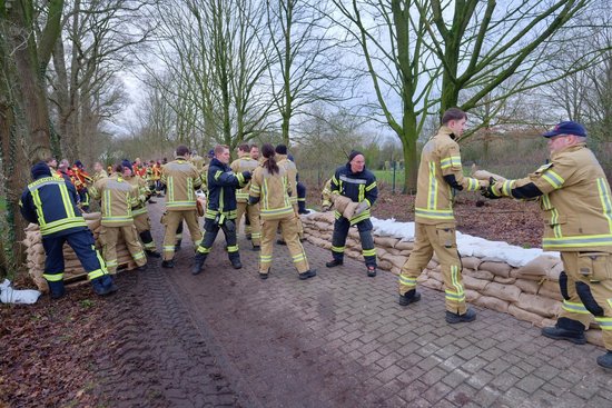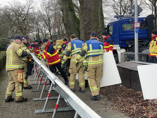 Während der Hochwasserlage kamen rund 95.000 gefüllte und ungefüllte Sandsäcke zum Einsatz. Die Freiwilligen Feuerwehren aus Oldenburg und den umliegenden Gemeinden legten tatkräftig Hand an und errichteten die Sandsack-Barrieren im Akkord. Gefährdete Haushalte konnten sich an zwei Terminen jeweils mit bis zu 15 Sandsäcken eindecken, um Öffnungen an ihren Häusern wie Kellerzugänge und Türen abzudichten. Ein Gefahrenschwerpunkt lag im Bereich Achterdiek, der zwischen Osternburger Kanal und Hunte an fast allen Seiten von Wasser umgeben ist und zu überfluten drohte. Im weiteren Verlauf gab es mit dem Bereich Bümmersteder Friedhof/Sandkruger Straße ein zweites Gebiet, das zusätzlichen Schutz benötigte. Hier wurden die Anwohnenden mittels eines gut zwei Kilometer langen mobilen Deichs in Form von Wasser-gefüllten Fässern (das sogenannte AquaRiwa-System beim Bümmersteder Friedhof) sowie Hartschaumplatten (entlang der Sandkruger Straße) gesichert. Möglich wurde dies auch durch die tatkräftige Hilfe von nah und fern: So waren beispielweise THW-Helferinnen und -Helfer aus Emden, St. Peter Ording und Berlin in Oldenburg im Einsatz, der Notdeich wurde unter anderem aus Augsburg und Rostock geliehen und ein Bürgermeister aus dem Ahrtal wollte sogleich einen Bus mit weiterer Unterstützung in unsere Region schicken. Die DLRG Oldenburg war für die Sandsackfüllung und Treibgutsicherung im Einsatz, zudem bereitete sich die DLRG Rastede auf die Absicherung des für eine mögliche Deichöffnung vorgesehenen Baggerfahrers vor.