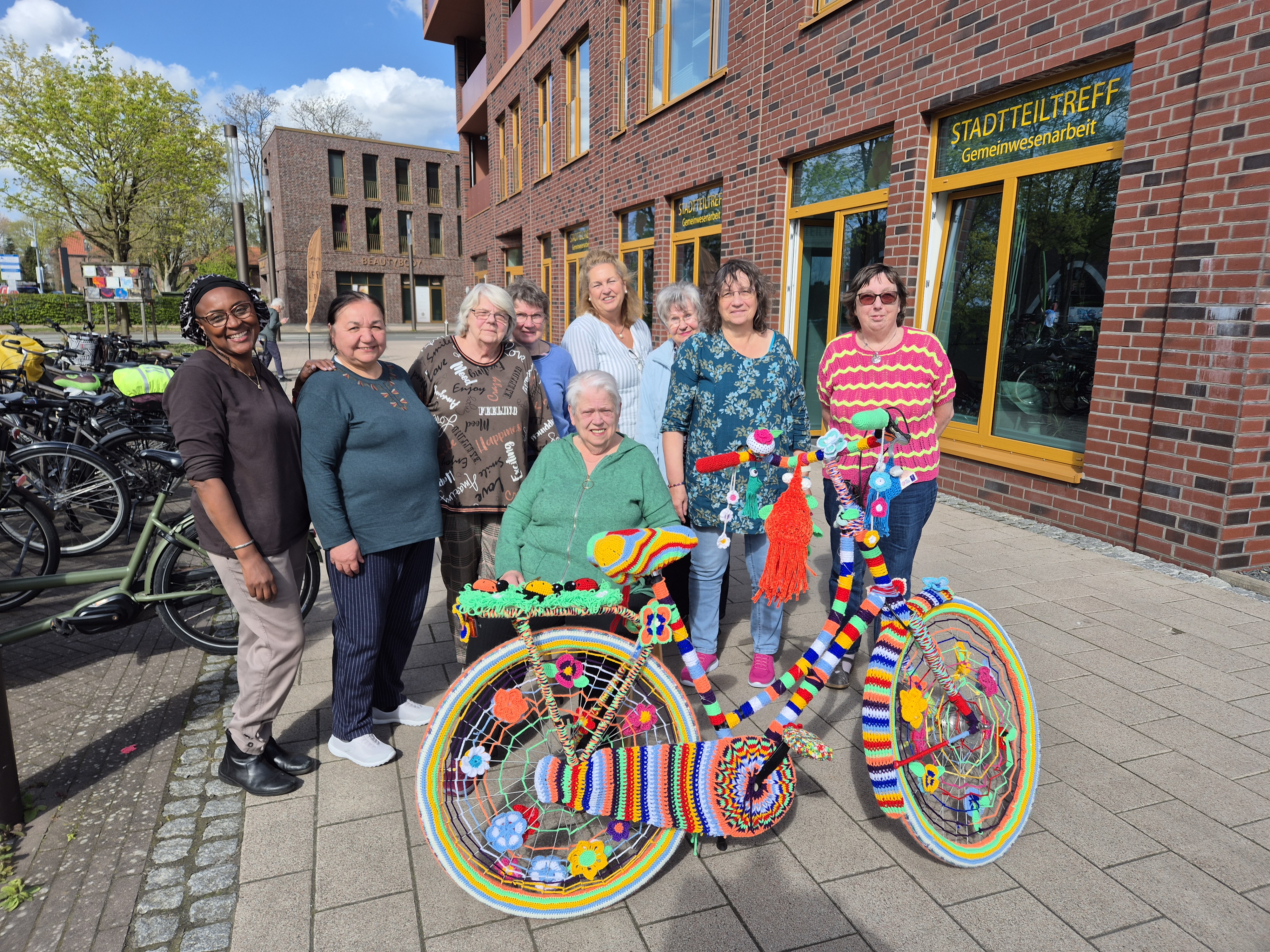 Oldenburg. Ein farbenfrohes, vollständig umstricktes Fahrrad zieht derzeit die Blicke im Stadtteiltreff Kreyenbrück, Alter Postweg 1, auf sich. Verantwortlich für dieses außergewöhnliche Kunstobjekt ist die Gruppe „Stricken und Häkeln für Anfänger und Fortgeschrittene“, die dort regelmäßig aktiv ist. Zugleich macht das gestaltete Rad auf ein weiteres Angebot aufmerksam: Mitte April ist der Fahrradkurs für Erwachsene in die neue Saison gestartet. Zudem feiert in diesem Jahr die Radfahrschule ihr 15-jähriges Bestehen.