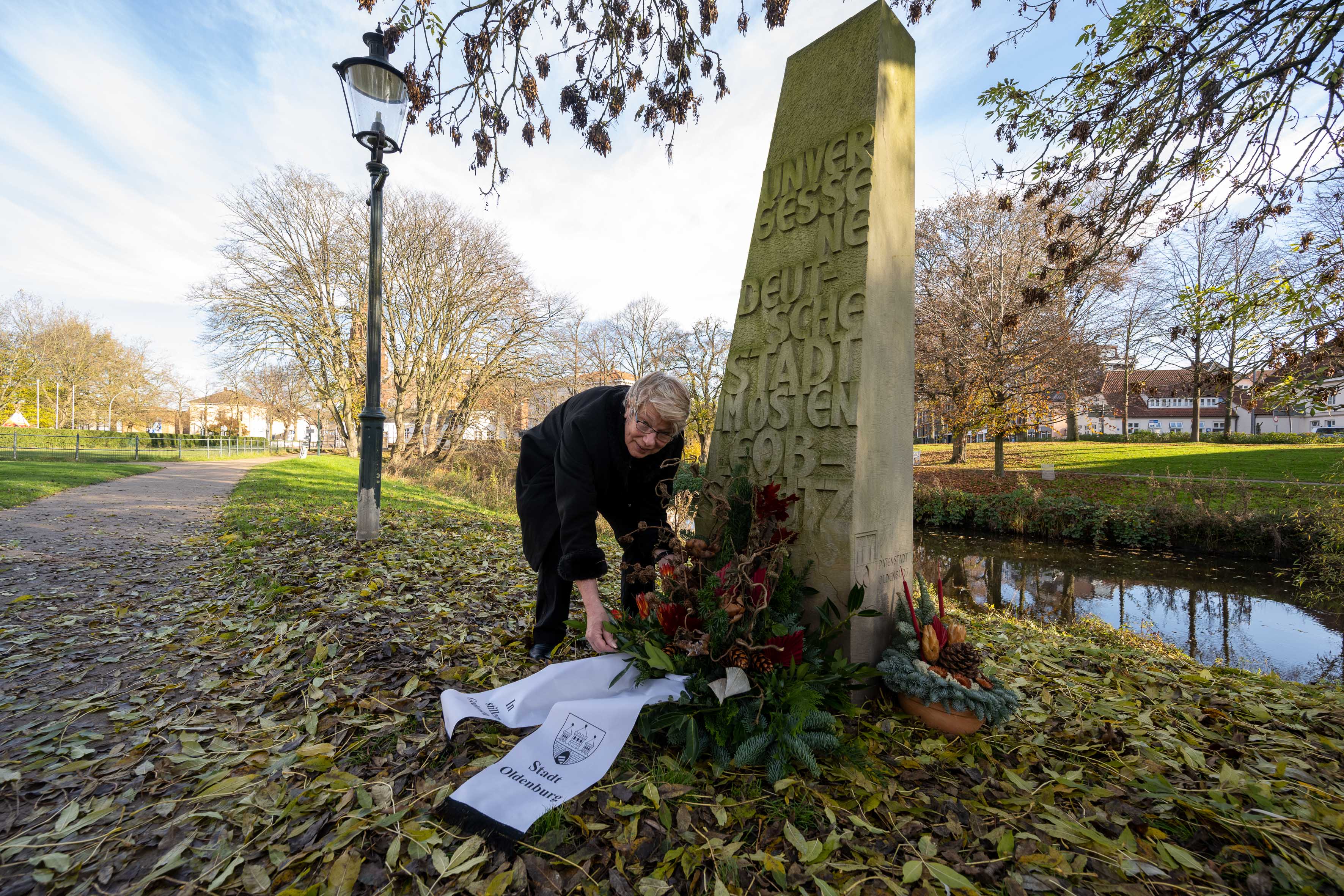Oldenburg. Am Volkstrauertag (15. November) hat Bürgermeisterin Germaid Eilers-Dörfler am Mahnmal für alle Opfer des Nationalsozialismus einen Kranz und am Leobschützer Gedenkstein ein Blumengebinde niedergelegt. Die an diesem Tag ursprünglich geplante Gedenkfeier des Volksbundes Deutsche Kriegsgräberfürsorge im Alten Landtag musste leider wegen der Einschränkungen durch die Corona-Pandemie abgesagt werden.