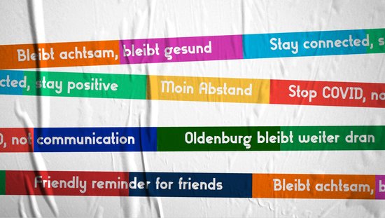 • Mit aufwändig und auffällig gestalteter Street- und Tape-Art macht Robert Hoffmann-Lohse auf die Verhaltensregeln aufmerksam. Unter dem Motto „Oldenburg bleibt (w)achtsam“ hat er neben leuchtend-bunten Absperrbändern ein ganze Markenwelt erschaffen, die ausdrucksstark an die AHA-Regeln erinnert und an Zusammenhalt appelliert.
