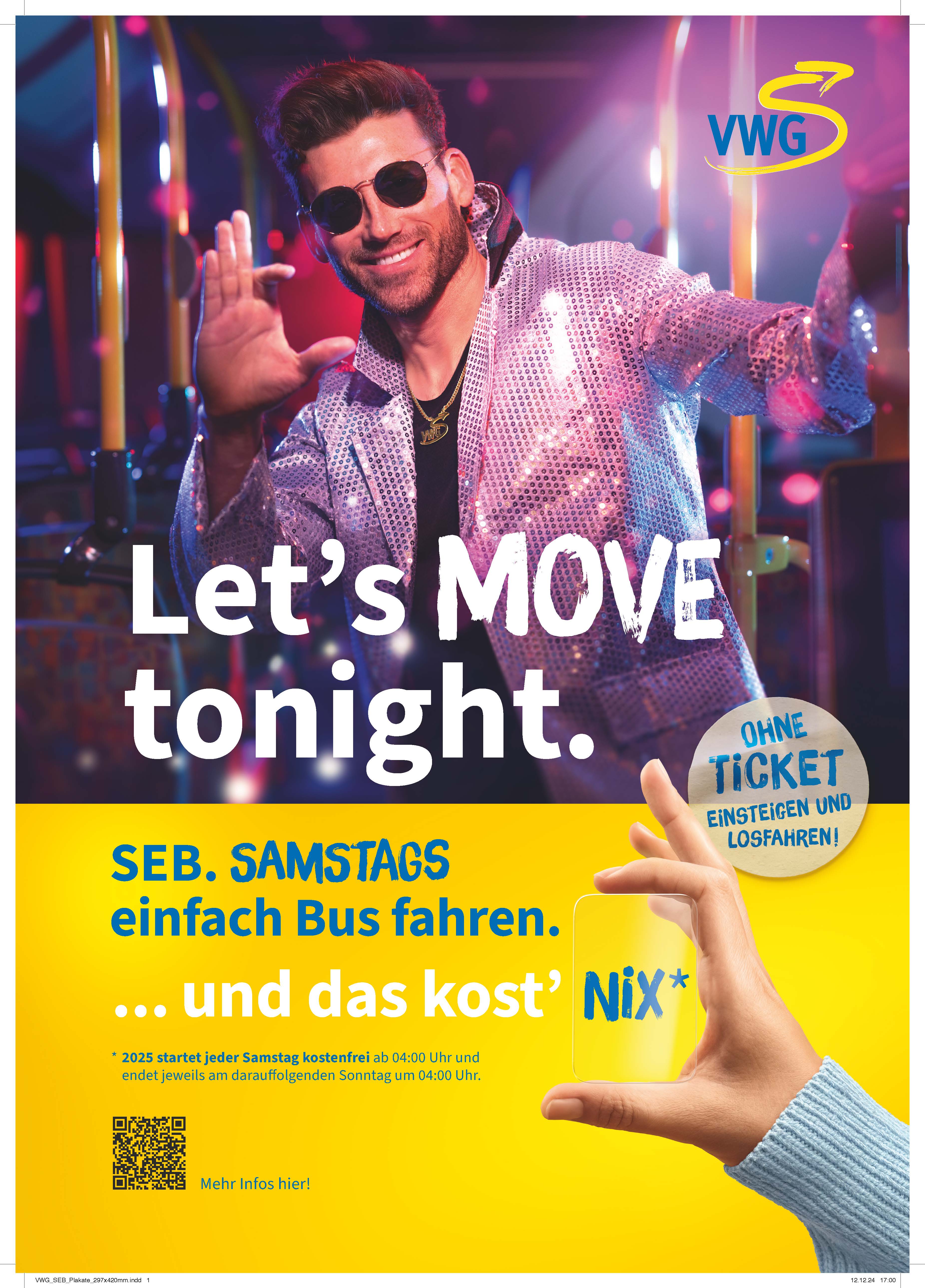 Die Einführung eines kostenlosen Busverkehrs an Samstagen im Jahr 2025 wurde am 26. August 2024 durch den Rat der Stadt Oldenburg beschlossen und durch die VWG umgesetzt. Fahrgäste, die an Samstagen innerhalb der Preisstufe I (Oldenburg) unterwegs sind, benötigen kein Ticket. Diese Regelung gilt ausschließlich für Fahrten, die komplett innerhalb der Preisstufe I (Oldenburg) liegen, also zum Beispiel von Hundsmühlen, Friedrichsfehn, Wehnen, Ofenerfeld, Wahnbek nach Oldenburg und natürlich auch für alle Fahrten innerhalb der Stadtgrenze von Oldenburg. Die Aktion wird unter dem Namen SEB – „Samstags einfach Bus fahren“ durch die VWG beworben.