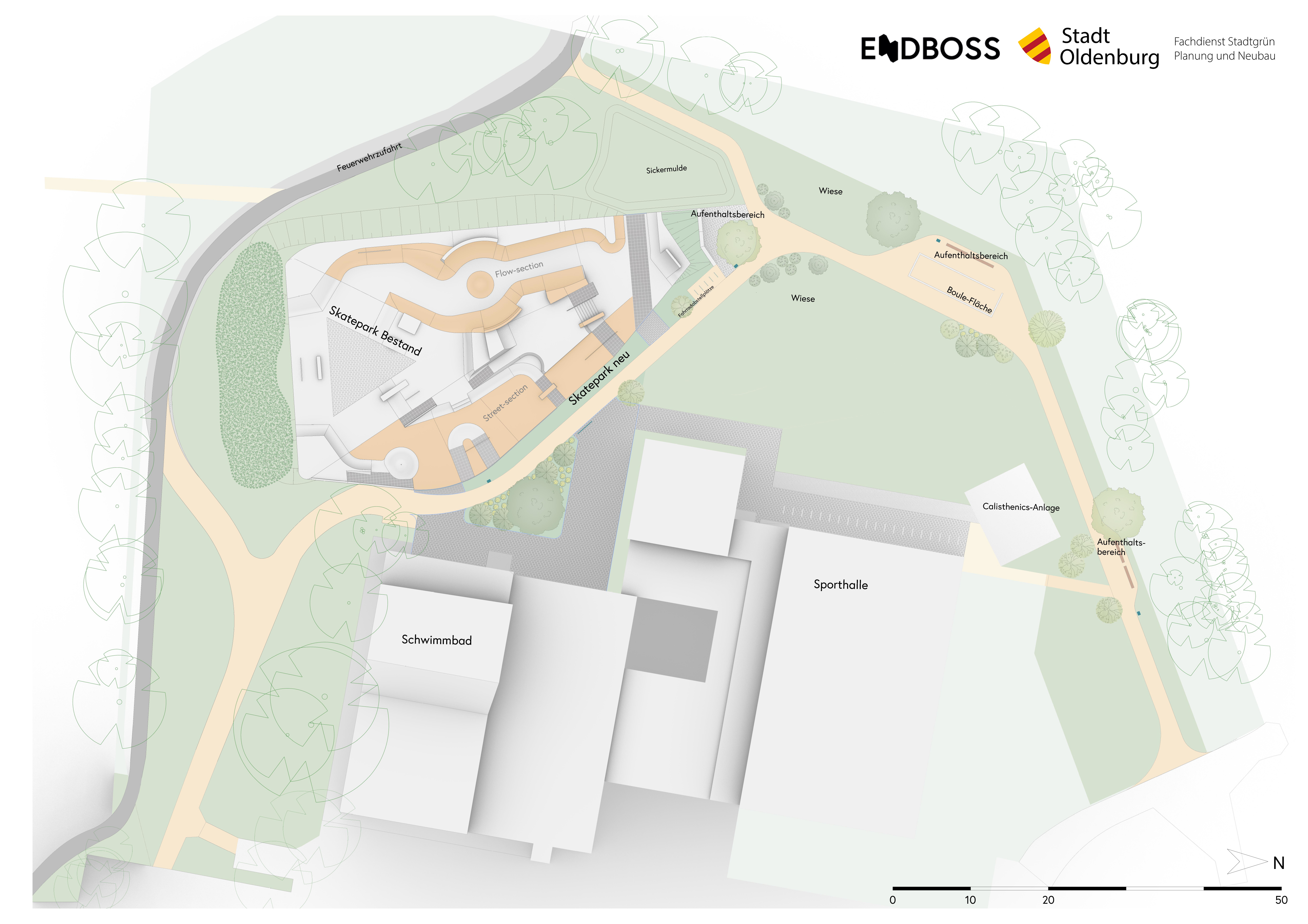 Die Planung des Skate- und Freizeitareals erfolgte durch das Büro endboss aus Hannover. Projektleitend begleitet wurde das Vorhaben vom Fachdienst Stadtgrün – Planung und Neubau der Stadt Oldenburg. Mit dem Bau der Skateanlage war die Firma Yamato Living Ramps aus Hannover beauftragt, die Aufwertung der Grünanlage übernahm das Garten- und Landschaftsbauunternehmen Quathamer GmbH aus Bad Zwischenahn.