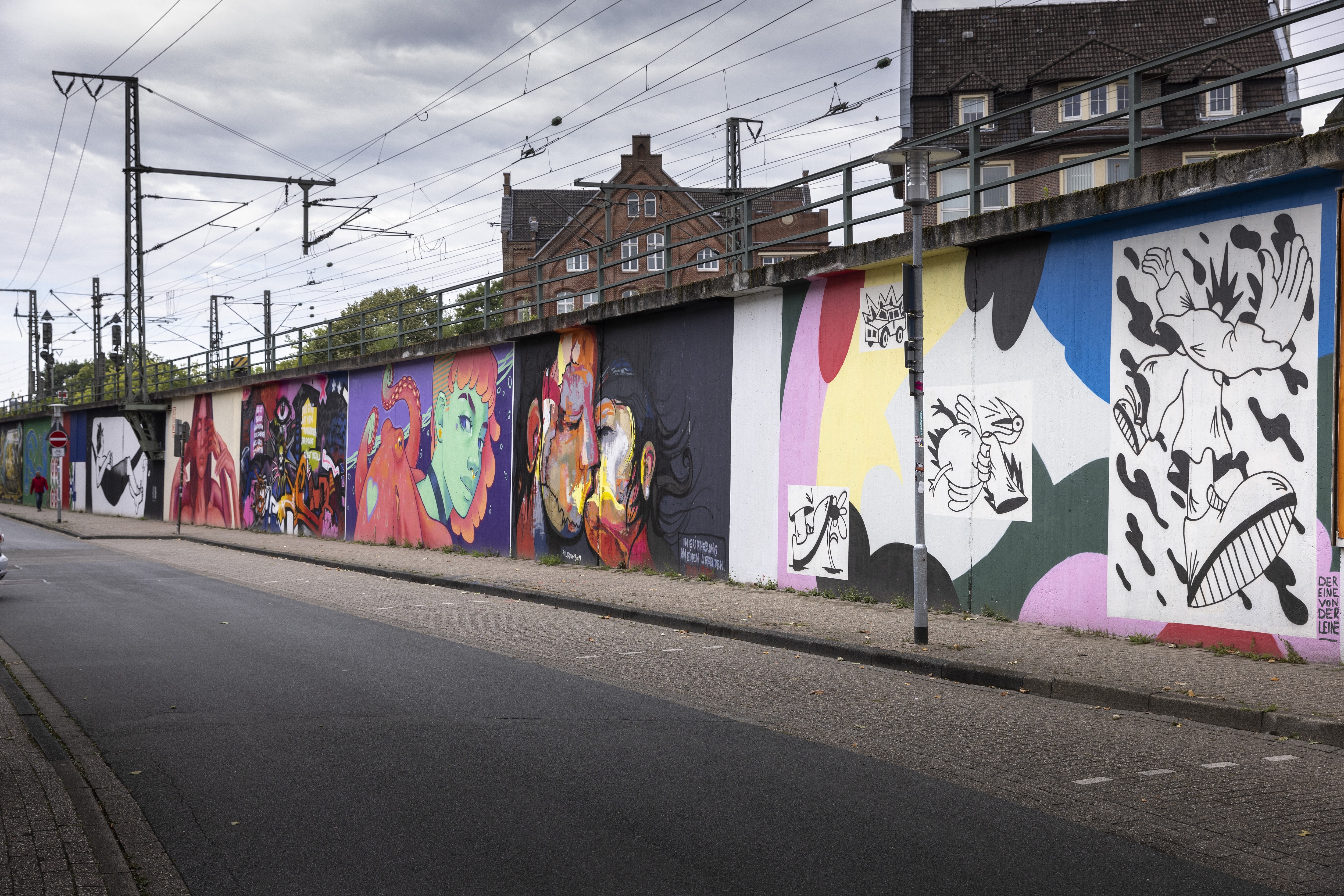 Die 280 Meter lange Wandfläche am Bundesbahnweg erstrahlt seit dem Spätsommer 2022 in neuem Glanz. Im Rahmen des Memur Urban Art Festivals entstand dort eine Freiluftgalerie. Regionale und internationale Künstlerinnen und Künstler widmeten sich mit ihren Wandbildern den Erlebnissen und Eindrücken der vergangenen Jahre. Pandemie, Krieg und gesellschaftliche sowie politische Themen wurden zu Werken der kollektiven Erinnerung verarbeitet. Bei dem Spaziergang entlang des Bundesbahnwegs am Freitag, 9. Juni, 17 und 18.30 Uhr geben Ihnen die Festivalmacherinnen und -macher spannende Einblicke in das Genre der Urban Art und die verschiedenen Kunstwerke.