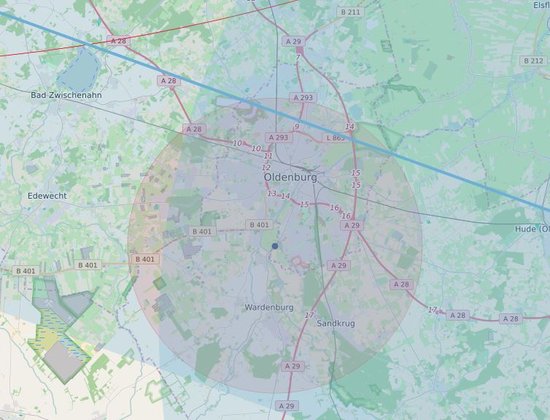 Oldenburg. Aufgrund der anhaltend angespannten Hochwasserlage hat die Deutsche Flugsicherung seit Sonntag, 31. Dezember, 10.07 Uhr, für den Luftraum über der Stadt Oldenburg und angrenzenden Gebieten eine Überflugverbotszone eingerichtet. Die Zone hat einen Radius von 9,26 Kilometern. Das bis einschließlich zum 3. Januar wirksame Überflugverbot gilt bis zu einer Höhe von 1.000 Fuß (304,8 Meter). Betroffen sind sämtliche Fluggeräte, inklusive Privatmaschinen und private Drohnen. Der Luftraum muss Einsatz- und Erkundungsflügen vorbehalten bleiben.