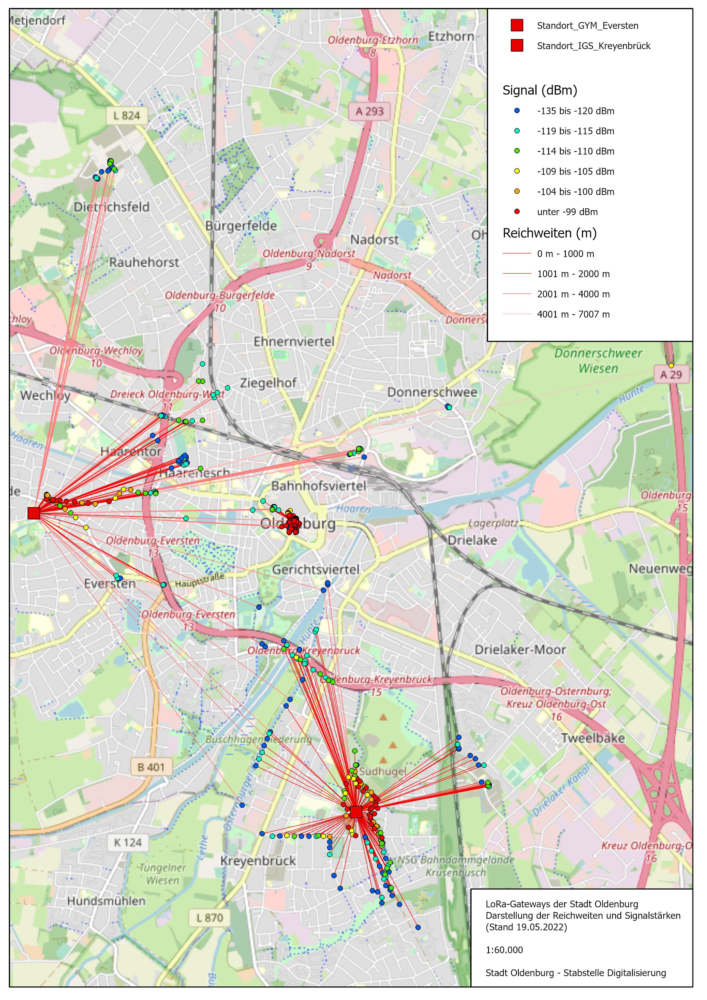 Die Stadt Oldenburg hat im Mai 2022 die ersten zwei LoRa-Gateways für den Betrieb eines öffentlichen LoRa-Netzes (Long Range Network) installiert. Dieses Funknetzwerk ermöglicht das energieeffiziente Senden von kleinen Datenpaketen über lange Strecken (bis zu mehreren Kilometern). Im Gegensatz dazu werden beim WLAN große Datenpakete (wie Filme) über kurze Strecken (zum Beispiel in einer Wohnung) gesendet. Solche LoRa-Netzwerke werden für die Übermittlung von Sensordaten im Kontext des Internets der Dinge oder Smart City verwendet. Ganz konkret bedeutet dies, dass zum Beispiel Ozonwerte oder die Temperatur im Stadtgebiet verteilt gemessen werden und über das LoRa-Netzwerk an einen städtischen Server übertragen werden. Die beiden ersten Gateways befinden sich auf der IGS in Kreyenbrück und dem Gymnasium in Eversten. Ein weiterer Ausbau des Netzwerkes ist geplant. Da es sich um ein öffentliches Netz handelt, kann es von Interessierten, seien es Bürgerinnen und Bürger, oder Vereine, Firmen oder Schulen, kostenfrei genutzt werden. Die Daten sind Ende-zu-Ende verschlüsselt, das heißt sie können nur vom rechtmäßigen Empfänger entschlüsselt werden. Neben der Stadt Oldenburg betreiben auch Privatpersonen, Unternehmen und Vereine einige Gateways im Stadtgebiet.