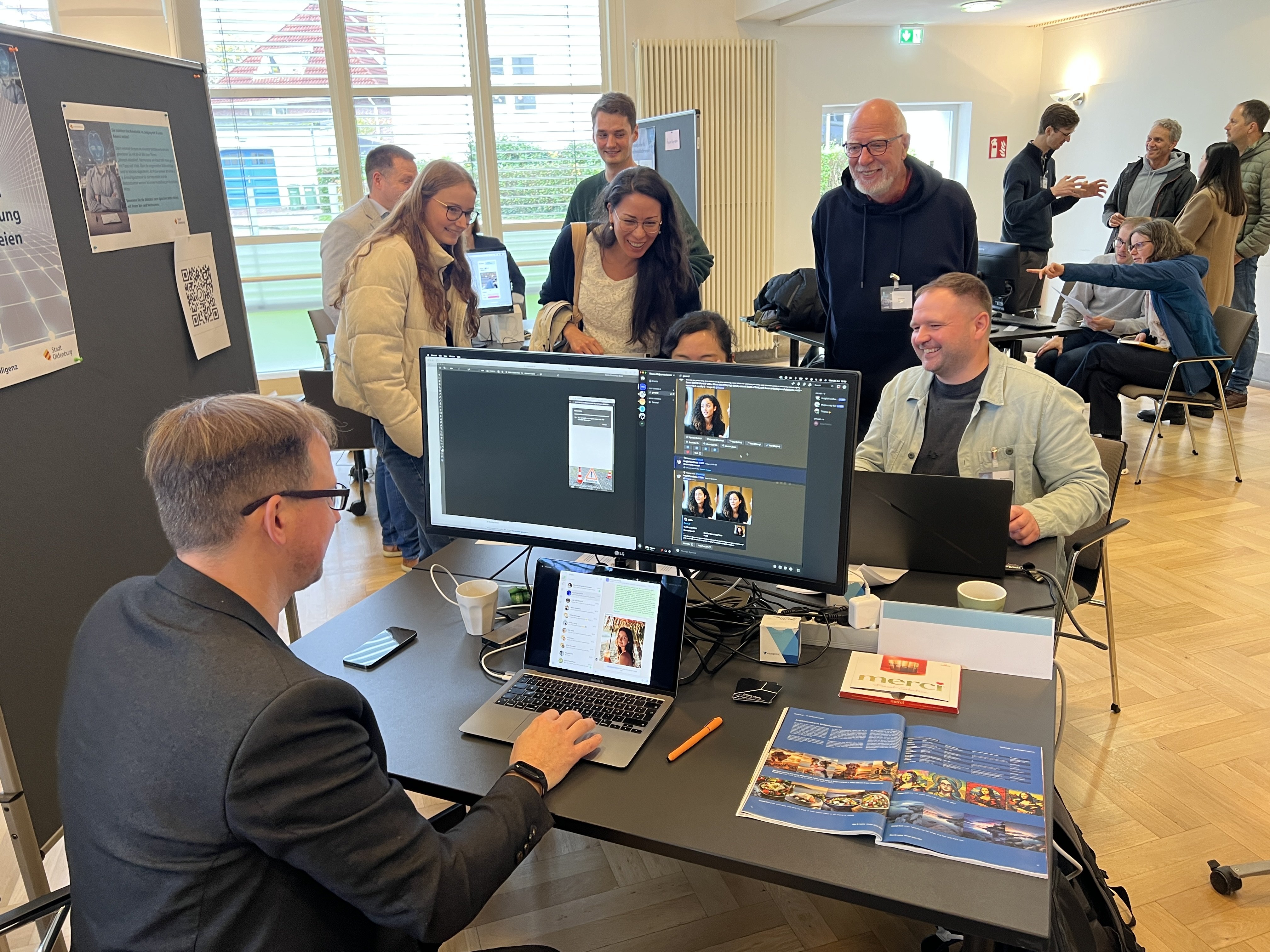 Die Veranstaltung bot parallel zahlreiche interaktive Stände. Interessierte konnten am Stand der BBS Wechloy mit Virtual Reality (VR)-Brillen rhetorische Übungen absolvieren oder sich über KI-Anwendungen wie Sprachmodelle, Mustererkennung oder Prompting-Methoden informieren. Für große Erheiterung sorgte ein Stand zur KI-Bildgenerierung, an dem zahlreiche große und kleine Kunstwerke entstanden. Das Amt für Personal und Organisation informierte die Kolleginnen und Kollegen darüber, wie das Thema KI in der Stadtverwaltung in nächster Zeit aufgegriffen wird. Dieser Stand wurde ebenfalls gern in Anspruch genommen und war Schauplatz eines regen Austausches. Zusammen mit dem OFFIS e.V. präsentierte sich das BUKI-Projekt. BUKI steht für „Bürgerfreundliche Dokumentenausfüllung basierend auf KI“ und untersucht seit Anfang 2024, wie KI bei der Ausfüllung komplexer Anträge sinnvoll unterstützen kann. Dies soll nicht nur den Antragstellenden das Leben erleichtern, sondern zugleich für weniger fehlerhafte Anträge und somit weniger Aufwand bei den Sachbearbeitenden sorgen. Zusätzlich präsentierte das Oldenburger Computer-Museum (OCM) anhand einiger Exponate kurzweilig die Entwicklung der Informationstechnologie.