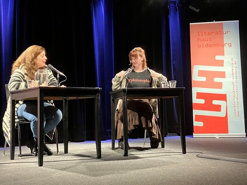 Kaja Geldmacher, Carolin Lewedag und Rieke Geldmacher wurden durch Rasha Khayat jeweils in kurzen Gesprächen auf der Bühne vorgestellt. Sie gaben Auskunft über ihre Schreibmotivation, fanden einleitende Formulierungen zu ihren vorgetragenen Texten und berichteten, wo sie Anregungen für ihre Geschichten finden. Selbstbewusst und souverän trugen sie dann ihre eigenen Texte vor: Kaja Geldmacher stellte unter dem Titel „Brief an mich“ einen Brief an ihr zukünftiges Ich vor, der durch eine Schreibübung aus der Werkstatt angeregt worden war. Als jüngste Teilnehmerin gelangte sie in ihren Formulierungen zu überraschend lebensklugen und ungewöhnlichen Überlegungen, die ihr schon in der Werkstatt den Spitznamen „Guru“ eingebracht hatten. Als „Philosophin“ wurde Carolin Lewedag von Rasha Khayat bezeichnet, und auch diese Einschätzung fand in der Erzählung „Am Horizont der Ewigkeit“, die sie mit sicherer Stimme fein akzentuiert vortrug, eine Entsprechung. Rieke Geldmacher, die „Poetin“, präsentierte ihre Erzählung „Die Gartenparty“ und den Poetry Slam-Text „Die Stimme von morgen“. Ihr Auftritt stellte eindrücklich unter Beweis, wie lange und mit welcher Ernsthaftigkeit sie sich dem eigenen Scheiben schon widmet.