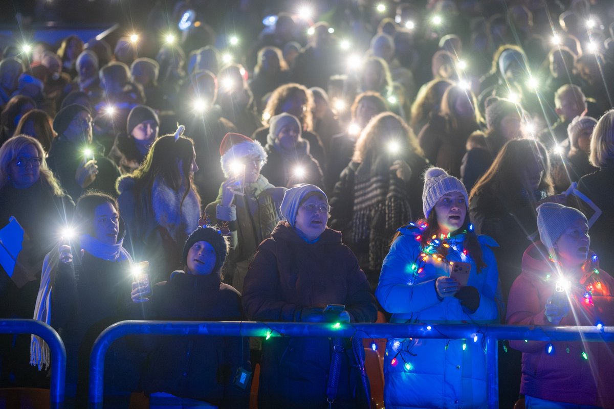 Die musikalische Aufstellung erwies sich als erstklassig: Besonders Sängerin Joline Brand begeisterte mit ihrer ausdrucksstarken Stimme. Für den mitreißenden musikalischen Rahmen sorgte die aus Lehrkräften der Musikschule bestehende Band mit Jens Korte am Schlagzeug, Jonas Mosebach am E-Piano und Boy R. Petersen am E-Bass. Ein Blasensemble sowie Nachwuchsgesangstalente aus den Kinderchören der Musikschule unter der Leitung von Chantal Cordes verliehen dem gemeinsamen Singen die nötige Klangfülle. Unterstützt wurde das Event von der Regionalen Stiftung der LzO, die mit einer Fördersumme von 7.000 Euro maßgeblich zum Gelingen beitrug. Die festliche Beleuchtung der Haupttribüne und der auf der Tartanbahn aufgebauten Bühne versetzte das Stadion zusätzlich in vorweihnachtliche Bestform. Feuerfontänen sorgten für optische Höhepunkte. Für Sound und Licht zeichnete in hervorragender Weise die Firma Teno verantwortlich.