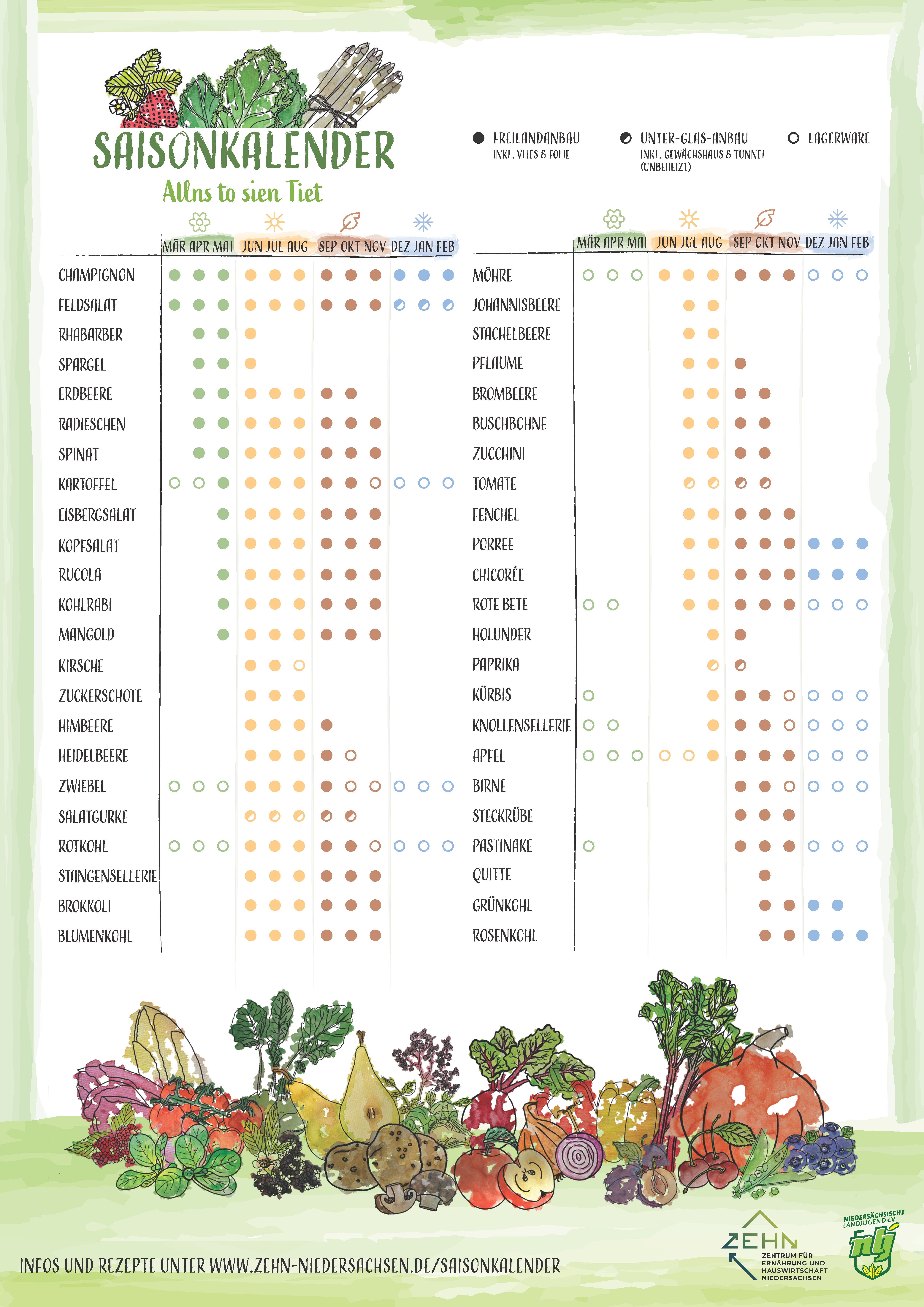 „Allns to sien Tiet“ – oder „Alles zu seiner Zeit“ – so ist es auch in der Natur beziehungsweise auf niedersächsischen Gemüseäckern und Obstplantagen. Gemeinsam haben die Niedersächsische Landjugend und das ZEHN einen Saisonkalender entwickelt, der einen Überblick über Erntezeiten in Niedersachsen gibt und noch mehr zu bieten hat. Auf der Internetseite von ZEHN erhalten Sie alle Informationen zum Saisonkalender »