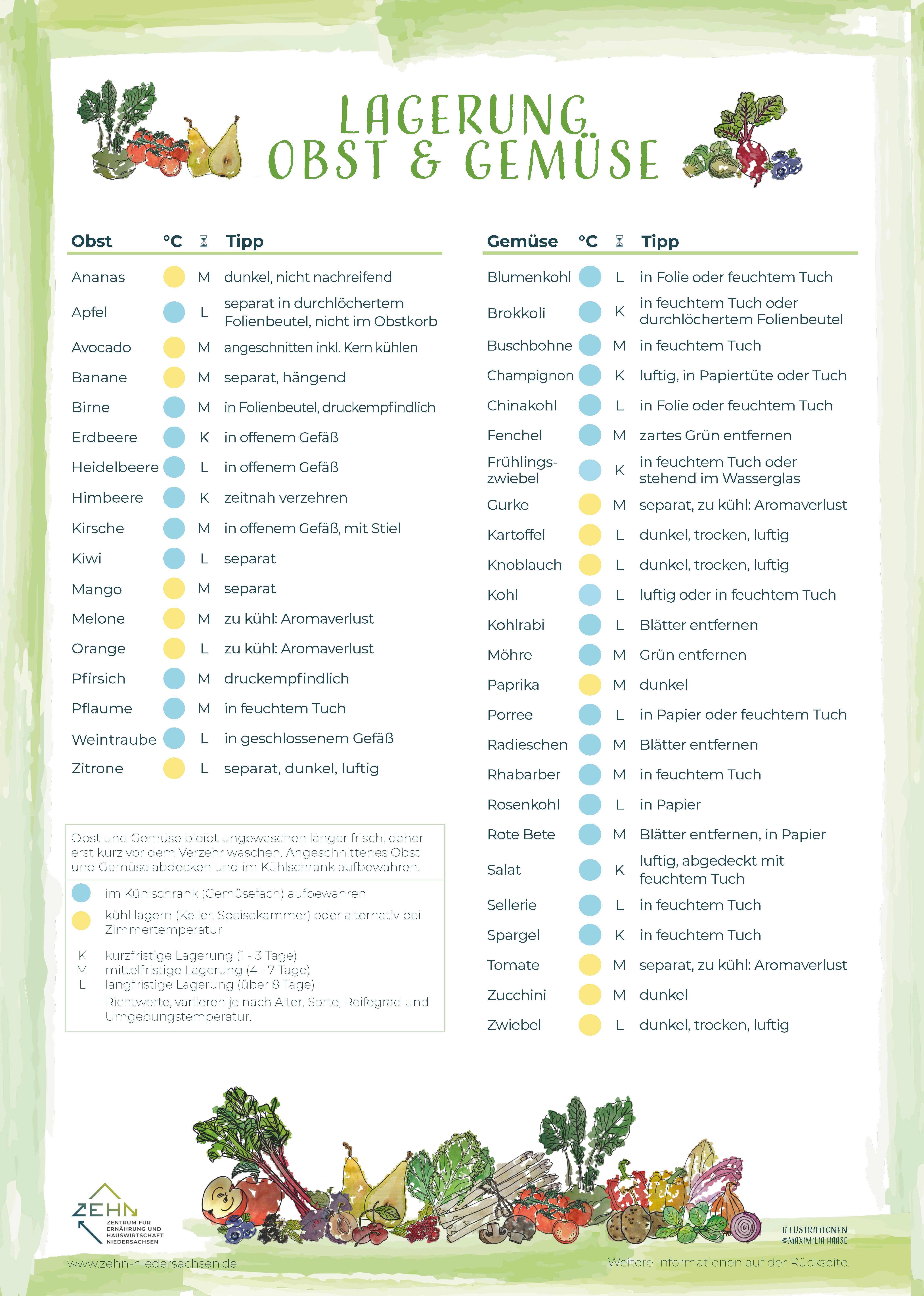 Um saisonale Ernährung sowie die nachhaltige Lagerung von Obst und Gemüse zu unterstützen, hat das Zentrum für Ernährung und Hauswirtschaft Niedersachsen (ZEHN) » einen übersichtlichen Saisonkalender sowie eine praktische Lagerübersicht für Obst und Gemüse erstellt. Beide Materialien helfen Verbraucherinnen und Verbrauchern dabei, bewusster einzukaufen und Lebensmittel länger frisch zu halten.