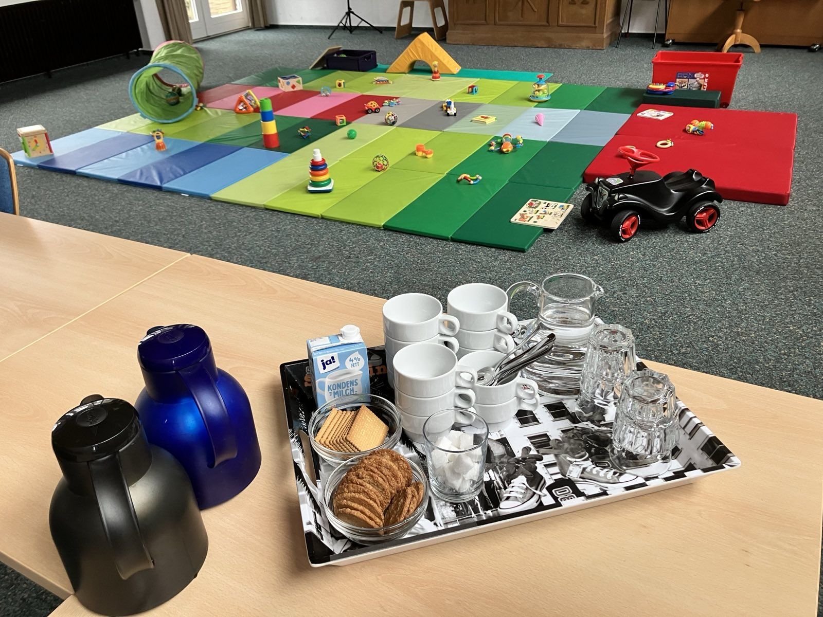 Café mit Bobbycar für Mütter mit ihren Kindern im Alter von ein bis drei Jahren