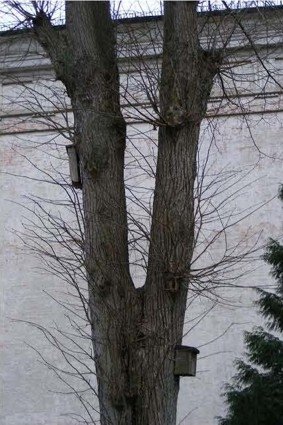 Kurz vor unserem Ziel, dem Mausoleum, blieben Olaf und ich gleichzeitig stehen, zeigten beide auf eine Stelle eines bestimmten Baumes und riefen dasselbe: „Guck mal: ein Fledermauskasten!“ Über Fledermauskästen haben wir gerade in der Schule gesprochen, deshalb wussten wir auch, wie die aussehen. Aber bis dahin haben wir noch nie einen in echt gesehen! Die sind ziemlich flach und haben die Öffnung für die Fledermaus UNTEN, damit die Fledermaus von unten in den Kasten hinein fliegen kann.