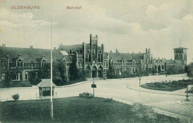 1867 wurde die Eisenbahnlinie Bremen – Oldenburg – Heppens (heute Wilhelmshaven) eröffnet. „Endlich“ kann man sagen, denn der Anschluss an die Eisenbahn war lange geplant. Zwei Jahre später, 1869, folgte die Eisenbahnlinie Oldenburg – Leer. Die Eisenbahnstrecke Oldenburg – Osnabrück wurde 1876 fertig gestellt. Die Bahnstrecke Oldenburg – Brake wurde erst 1896 in Betrieb genommen. Bei so viel Eisenbahnverkehr brauchte man auch einen Bahnhof. Anfangs gab es nur einen Güterschuppen, der als Bahnhof diente. Der erste Bahnhof wurde 1879 gebaut. Das Gebäude dieses „Centralbahnhofes“ war fast symmetrisch. Er musste 1911 dem heutigen Hauptbahnhof weichen.