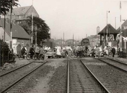 Dieses Bild ist so um 1966 entstanden. Hier siehst du wie in der Übergangszeit am Pferdemarkt Züge oben und unten fuhren. Das kann man sich heute schon kaum noch vorstellen, wie das früher war! Stell dir mal vor, wie es heute wäre, wenn bei jedem Zug die Autos, Fahrräder und Fußgänger am Pferdemarkt vor Schranken stehen müßten.