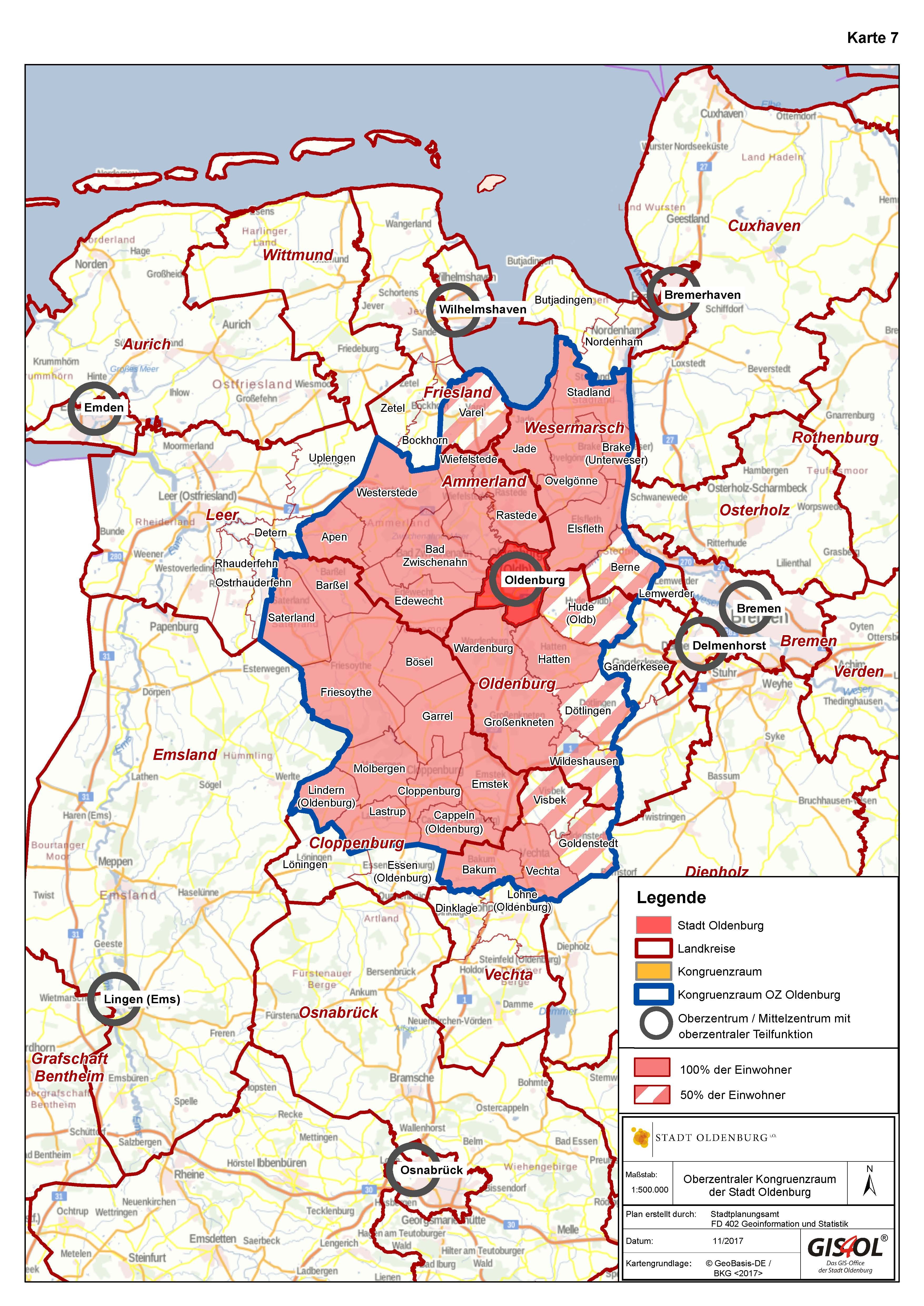 In der Landkarte werden die Oberzentren Oldenburg, Wilhelmshaven, Osnabrück, die Mittelzentren mit oberzentraler Teilfunktion Lingen, Delmenhorst Emden sowie das Oberzentrum Land Bremen dargestellt. Es erfolgt eine Unterteilung der Zuordnung der Gemeinden zu 100 Prozent beziehungsweise zu 50 Prozent in den Kongruenzraum des Oberzentrums Stadt Oldenburg. Das bedeutet, dass die Kaufkraft der jeweiligen Einwohnerinnen und Einwohner entsprechend berücksichtigt wird. Die Abgrenzung des oberzentralen Kongruenzraues umfasst den Landkreis Ammerland zur Gänze. Aus dem Landkreis Wesermarsch gehören die Gemeinden Jade, Stadland, Brake, Ovelgönne sowie die Stadt Elsfleth zu 100 Prozent und die Gemeinde Berne zu 50 Prozent dazu; Die nördlichsten Gemeinden Butjardingen und Nordenham wurden nicht dem oberzentralen Kongruenzraum der Stadt Oldenburg zugeordnet. Die Gemeinde Varel wird zu 50 Prozent dem oberzentralen Kongruenzraum Stadt Oldenburg zugeordnet. Der Landkreis Cloppenburg ohne die Gemeinden Löningen und Essen (in Oldenburg) ist dem oberzentralen Kongruenzraum der Stadt Oldenburg zugeordnet genauso wie die Gemeinden Hatten, Wardenburg und Großenkneten aus dem Landkreis Oldenburg. Die Gemeinden Hude, Dötlingen und Wildenhausen wurden nur zu 50 Prozent zugeordnet. Die Gemeinden Vechta und Bakum werden zu 100 Prozent, die Gemeinden Visbek und Goldenstedt zu 50 Prozent dem Oldenburger Kongruenzraum zugerechnet.