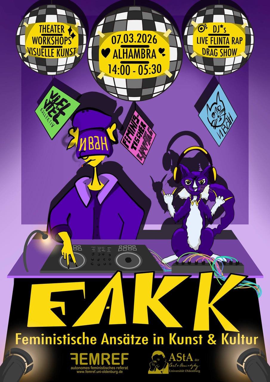 Mit FAKK – Feministische Ansätze in Kunst und Kultur öffnen die beiden Oldenburger Kollektive ИВАН und VielVielKollektiv einen Raum, der mehr ist als eine Party. Einen Tag lang verschmelzen hier Kunst, Musik, Performance, Workshops und politische Perspektiven zu einem lebendigen Ort des Austauschs – direkt vor dem feministischen Kampftag. FAKK ist kein Programm zum reinen Konsumieren, sondern ein Ort zum Mitmachen, Ausprobieren und Dazwischensein.