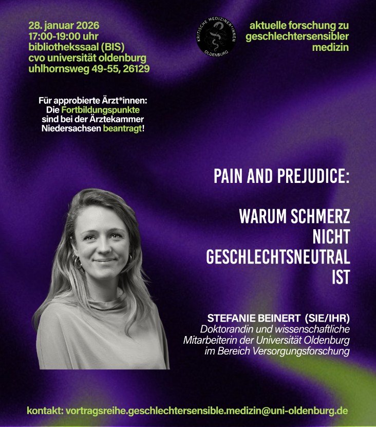 Fragen zur Vortragsreihe an die Kritischen Medizinerinnen per E-Mail an vortragsreihe.geschlechtersensible.medizin[at]uni-oldenburg.de
