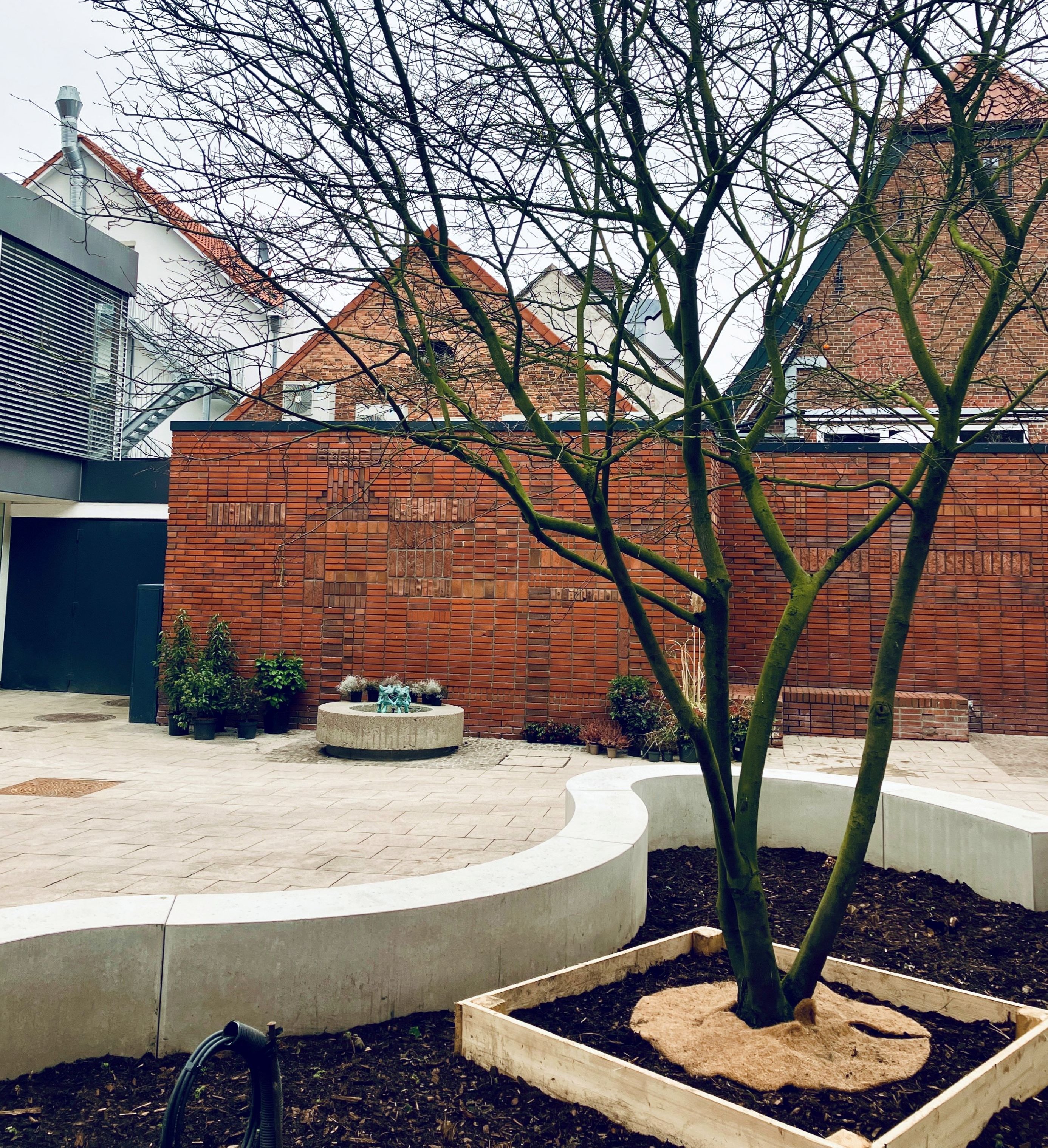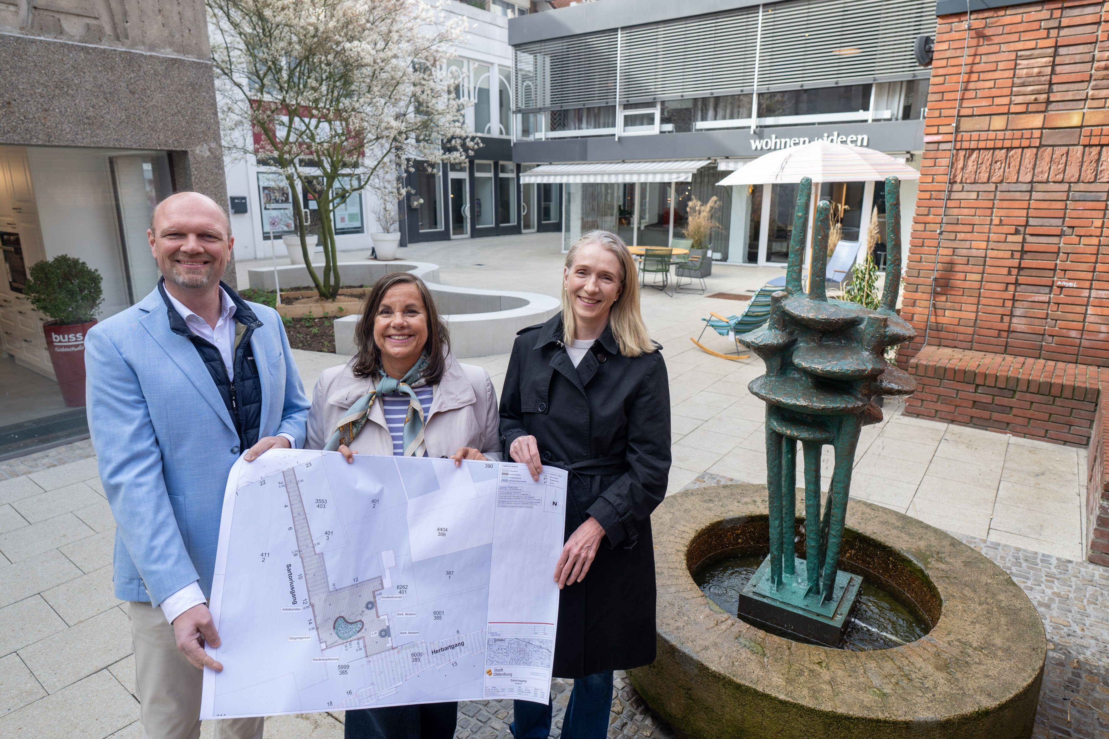 Die Sanierungsmaßnahmen im Sartoriusgang sind abgeschlossen – und damit lädt die Verbindung zwischen Herbartgang und Wallstraße wieder zum Verweilen ein. Stadtbaurätin Christine-Petra Schacht machte sich mit weiteren Mitgliedern der Verwaltung am Donnerstag, 9. April 2026, ein Bild von der neu entstandenen kleinen Oase in der Innenstadt. Diese kann sich sehen lassen: Ein zentral angelegtes, geschwungenes Pflanzbeet bildet mit einer erhöhten Einfassung aus hellem Beton eine einladende Ruhezone. Anfang des Jahres wurde eine Kupfer-Felsenbirne als Blickfang und Schattenspender gepflanzt. Nebenan sprudeln die frisch sanierten Brunnenskulpturen.