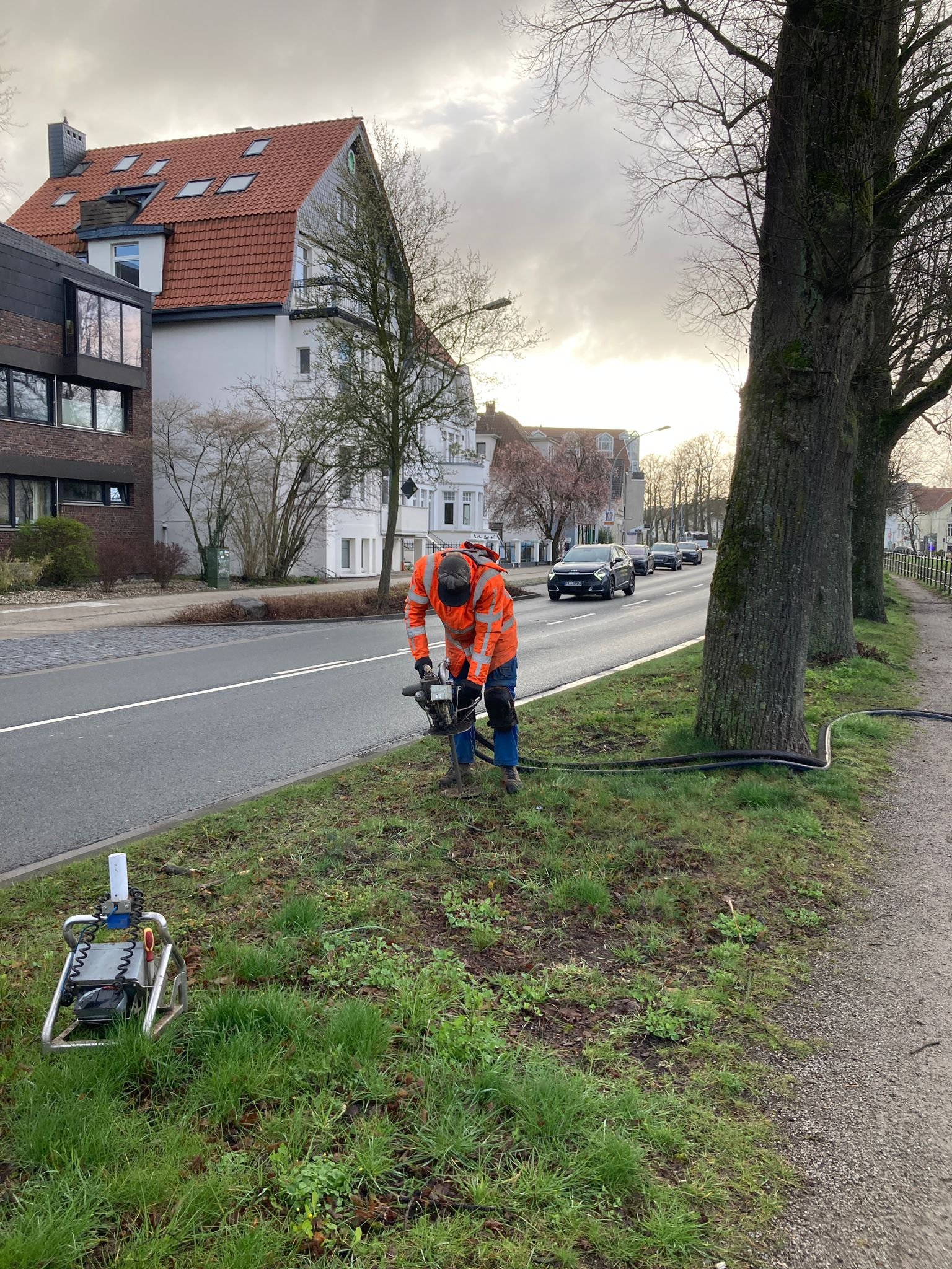 Den Abschluss der umfangreichen Maßnahme bildete die Verbesserung der Baumstandorte von 124 Linden an der Ofener Straße im März. Hier machte sich auch Umweltdezernentin Christine-Petra Schacht ein Bild und ließ sich das spezielle Verfahren genau erläutern. Gemeinsam mit Tanja Piening, Leiterin des Fachdienstes Stadtgrün – Planung und Neubau, sowie Jorit May, Leiter des Fachdienstes Stadtgrünpflege, ließ sie sich die einzelnen Schritte sowie die positiven Auswirkungen auf den Baum vor Ort von Norbert Müller (Firma TFI) zeigen.