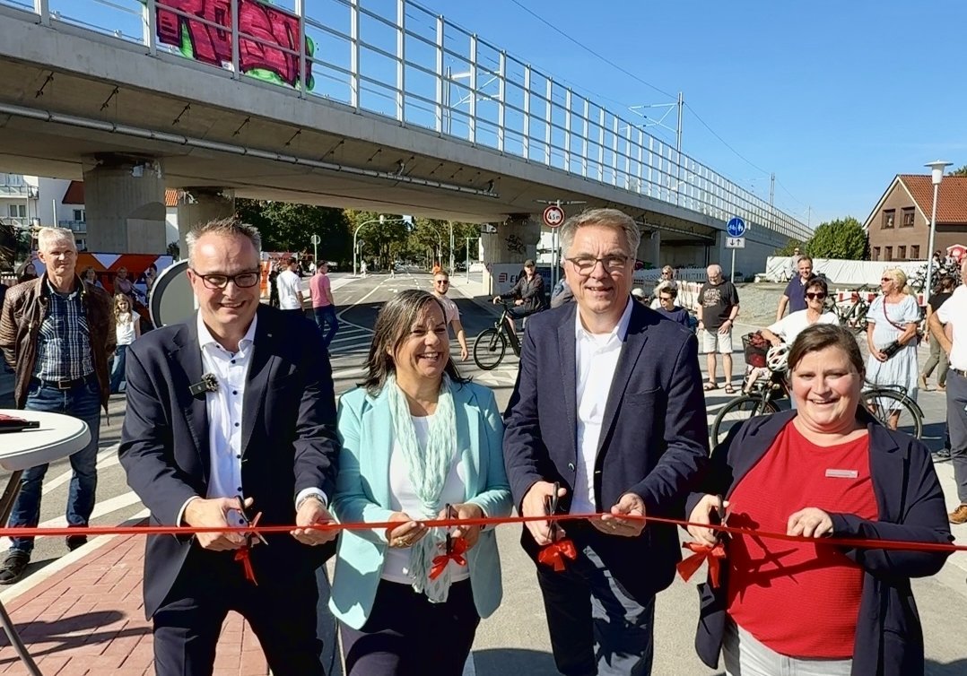 Die Deutsche Bahn hat die Arbeiten an der Alexanderstraße im Bereich der neuen Eisenbahnbrücke fertiggestellt. Die in rund sechs Monaten erneuerte Fahrbahn trägt zu mehr Sicherheit und Komfort für Verkehrsteilnehmende bei, auch die Durchfahrtshöhe von 4,50 Metern ist nun gewährleistet. Die Alexanderstraße ist seit Freitag, 19. September 2025, wieder für den Verkehr freigegeben. Zur Eröffnung durchschnitten Frank Limprecht, Leiter Infrastrukturprojekte Nord bei der Deutschen Bahn InfraGO AG, Oberbürgermeister Jürgen Krogmann und DB InfraGO-Projektleiterin Rebekka Stuhlmann ein Band.
