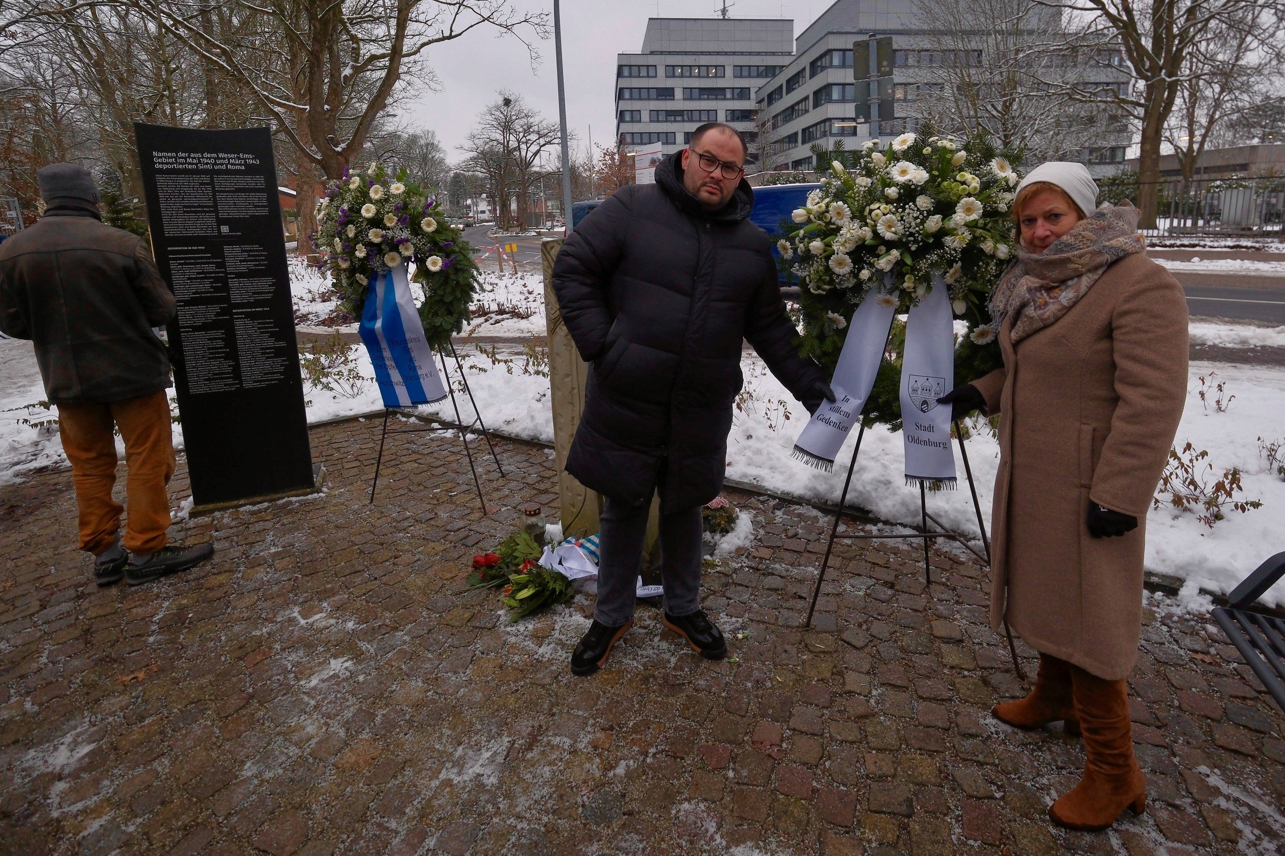 Bürgermeisterin Christine Wolff hat am Dienstag, 27. Januar 2026, gemeinsam mit dem Vorsitzenden des Freundeskreises für Sinti und Roma in Oldenburg e. V., Patrick Schwarz, am Mahnmal für Sinti und Roma (Friedhofsweg/Ecke Jägerstraße) Kränze niedergelegt. Beide machten mit dieser Geste auf den Gedenktag für die Opfer des Nationalsozialismus aufmerksam, der am 27. Januar anlässlich der Befreiung des Konzentrationslagers Auschwitz vor 81 Jahren begangen wird.