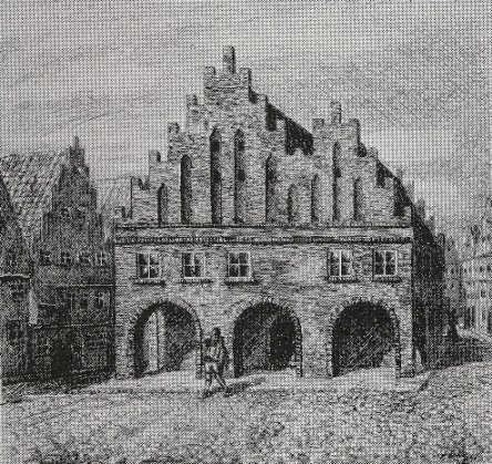 Eine Federzeichnung von 1598 (oben links) zeigt das spätmittelalterliche Rathaus. Es handelt sich wahrscheinlich um das zweite Oldenburger Rathaus.
