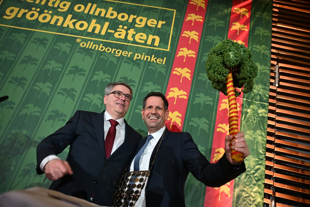 Olaf Lies (SPD) war bereits mehrfach als Kabinettsmitglied der Niedersächsischen Landesregierung zu Gast beim „Defftig Ollnborger Gröönkohl-Äten“ in Berlin – am Montagabend, 2. März 2026, ist er nun zum Nachfolger von Daniel Günther (CDU), Ministerpräsident des Landes Schleswig-Holstein, gekürt worden. „Mit meiner Leidenschaft für ein gutes Grünkohlessen fühle ich mich im Herzen des Oldenburger Landes zuhause – eine Region voller Bodenständigkeit, Vertrauen und Zukunftsmut. Es ist mir eine Ehre, nun Kohlmajestät sein zu dürfen. Oldenburg kann sich sicher sein, dass ich die Stadt und das Amt in der ganzen Republik würdevoll und auf kulinarisch höchstem Niveau vertreten werde“, so Niedersachsens Ministerpräsident.