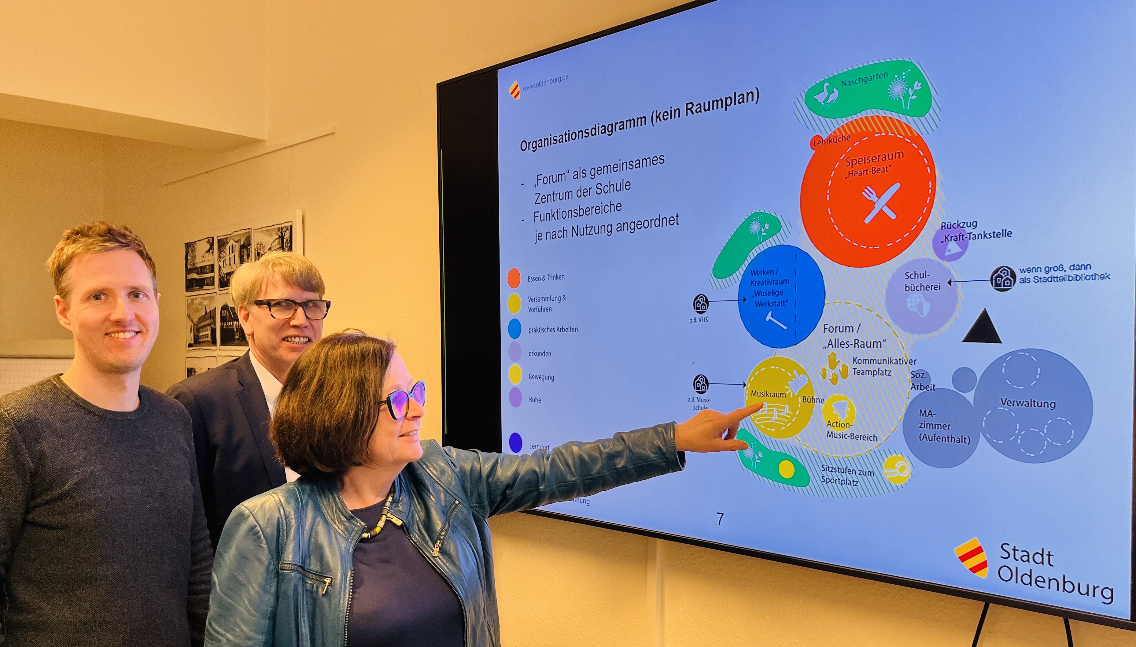 Der Erarbeitung des Raumprogramms liegt eine besondere Note zugrunde. Es ist das Ergebnis eines Projektes zur Schulbauberatung durch das Institut für Partizipatives Gestalten (IPG) mit dem Organisations- und Schulentwicklungsbüro Lotz & Monssen. In zwei gut besuchten und produktiven „Schulbauwerkstätten“ wurden am 19./20. Januar und 10. März 2023 Eltern, Schülerinnen und Schüler, Vertretungen der Verwaltung, des Landes Niedersachsen, des Oldenburger Stadtrates sowie verschiedener fachlicher Arbeitsgruppen beteiligt. „Das nun vorliegende Raumprogramm ist zeitgemäß, nachvollziehbar und angemessen. Es handelt sich um einen modernen und dabei nicht radikalen Vorschlag“, sagt Jan Reinder Freede, Leiter des Fachdienstes Schulentwicklung.